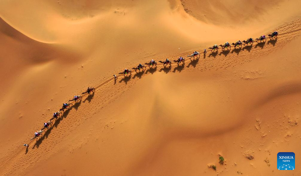 This aerial photo taken on July 20, 2023 shows visitors riding camels at the Shapotou scenic spot in Zhongwei, northwest China's Ningxia Hui Autonomous Region. Shapotou scenic spot in Zhongwei of northwest China's Ningxia has entered its peak tourism season during the summer vacation, with the largest daily visitor flow reaching over 10,000. (Xinhua/Wang Yuguo)