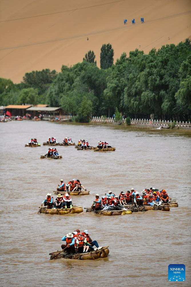 Visitors take sheepskin rafts at the Shapotou scenic spot in Zhongwei, northwest China's Ningxia Hui Autonomous Region, July 20, 2023. Shapotou scenic spot in Zhongwei of northwest China's Ningxia has entered its peak tourism season during the summer vacation, with the largest daily visitor flow reaching over 10,000. (Xinhua/Feng Kaihua)
