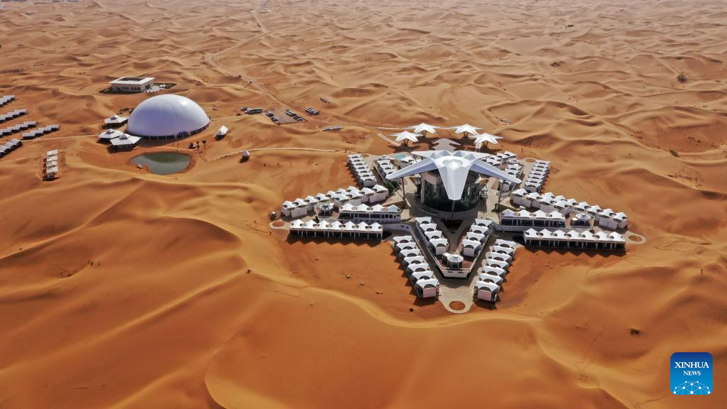 This aerial photo taken on July 20, 2023 shows a resort in the Tengger Desert in the Shapotou scenic spot in Zhongwei, northwest China's Ningxia Hui Autonomous Region. Shapotou scenic spot in Zhongwei of northwest China's Ningxia has entered its peak tourism season during the summer vacation, with the largest daily visitor flow reaching over 10,000. (Xinhua/Wang Peng)