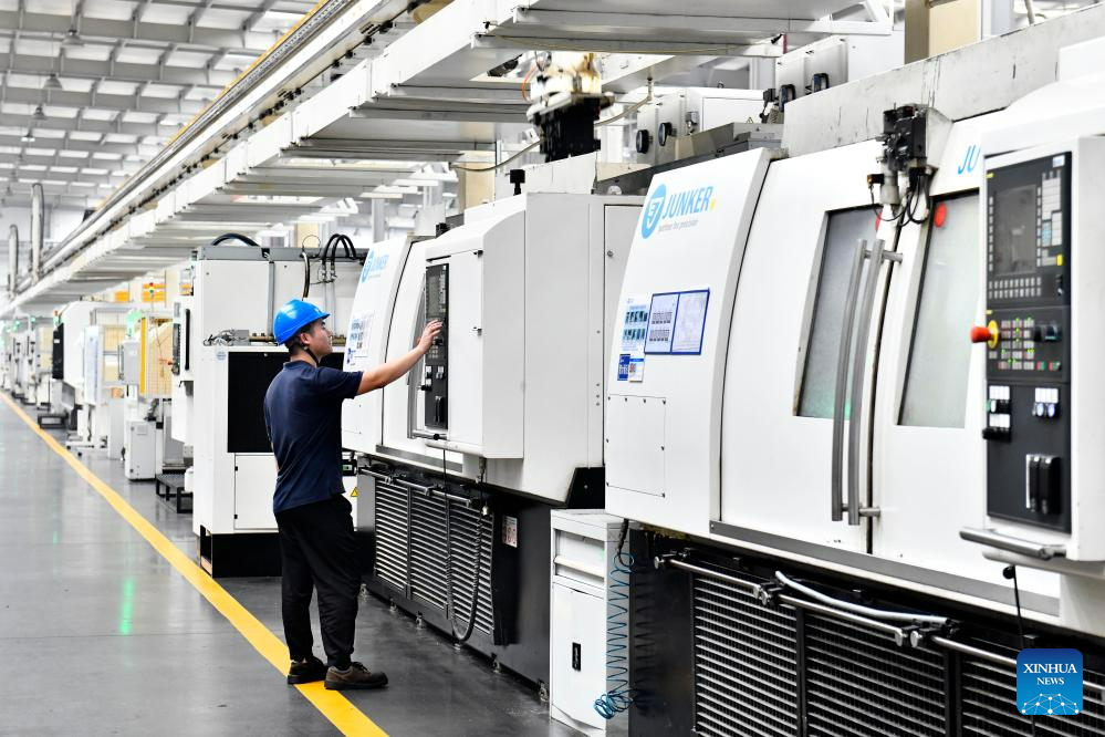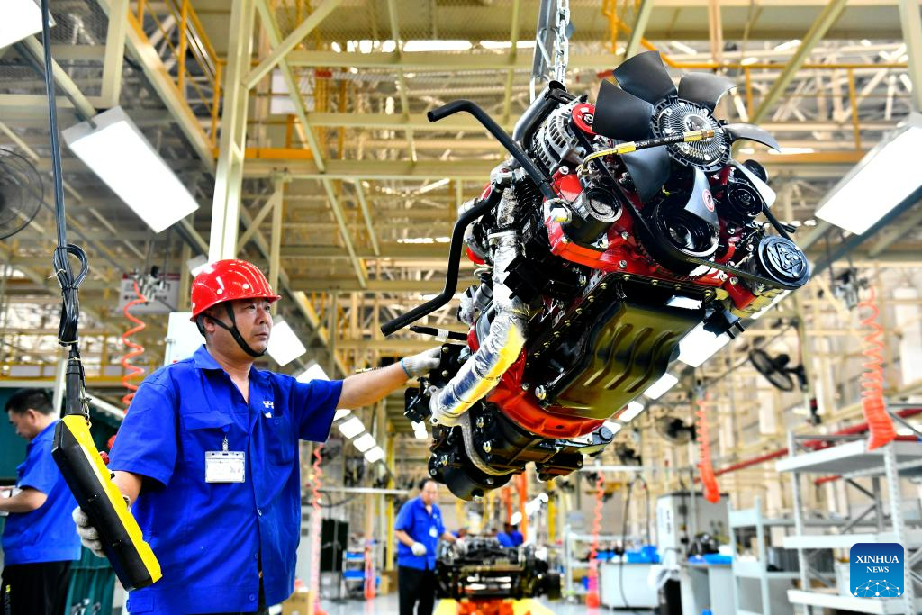 A worker lifts an engine at the production line of Weichai New Energy Commercial Vehicle Co., Ltd. in Wendeng District of Weihai City, east China's Shandong Province, July 21, 2023.
