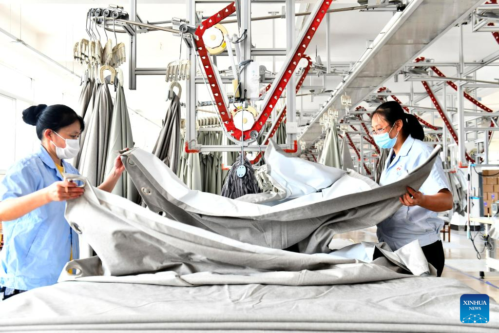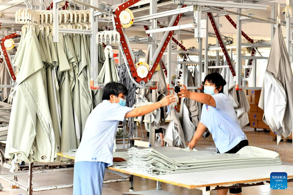 Workers process textile products at a home textile company in Wendeng District of Weihai City, east China's Shandong Province, July 21, 2023.