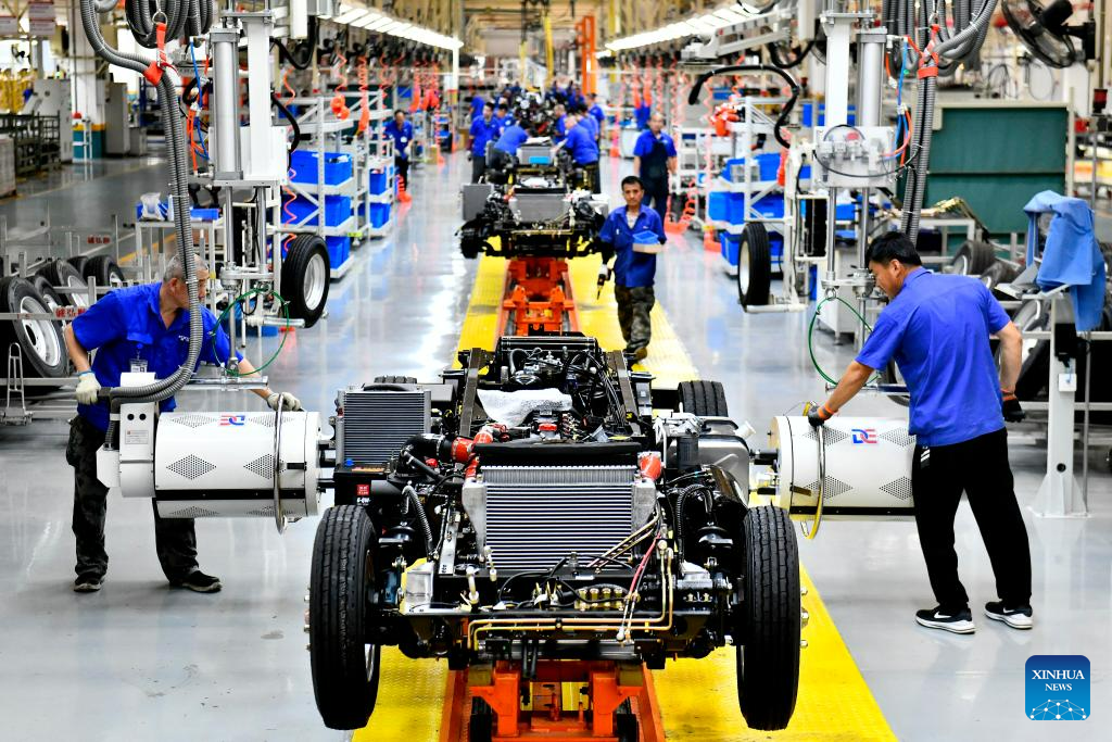 Workers assemble automobiles at the production line of Weichai New Energy Commercial Vehicle Co., Ltd. in Wendeng District of Weihai City, east China's Shandong Province, July 21, 2023.