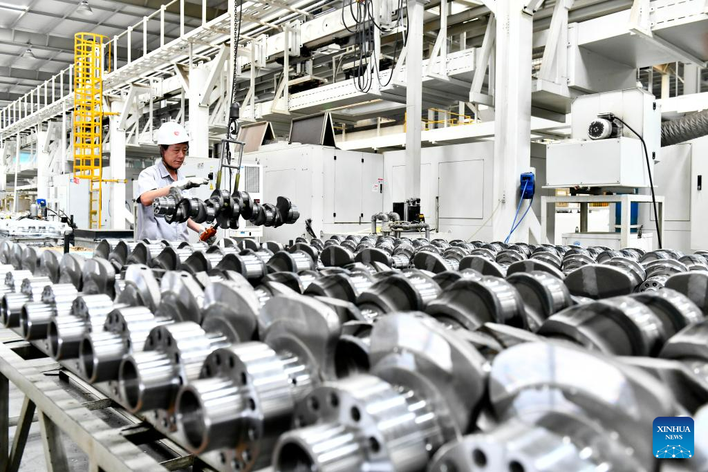 A worker lifts a crankshaft product at Tianrun Industrial Technology Co., Ltd. in Wendeng District of Weihai City, east China's Shandong Province, July 21, 2023.