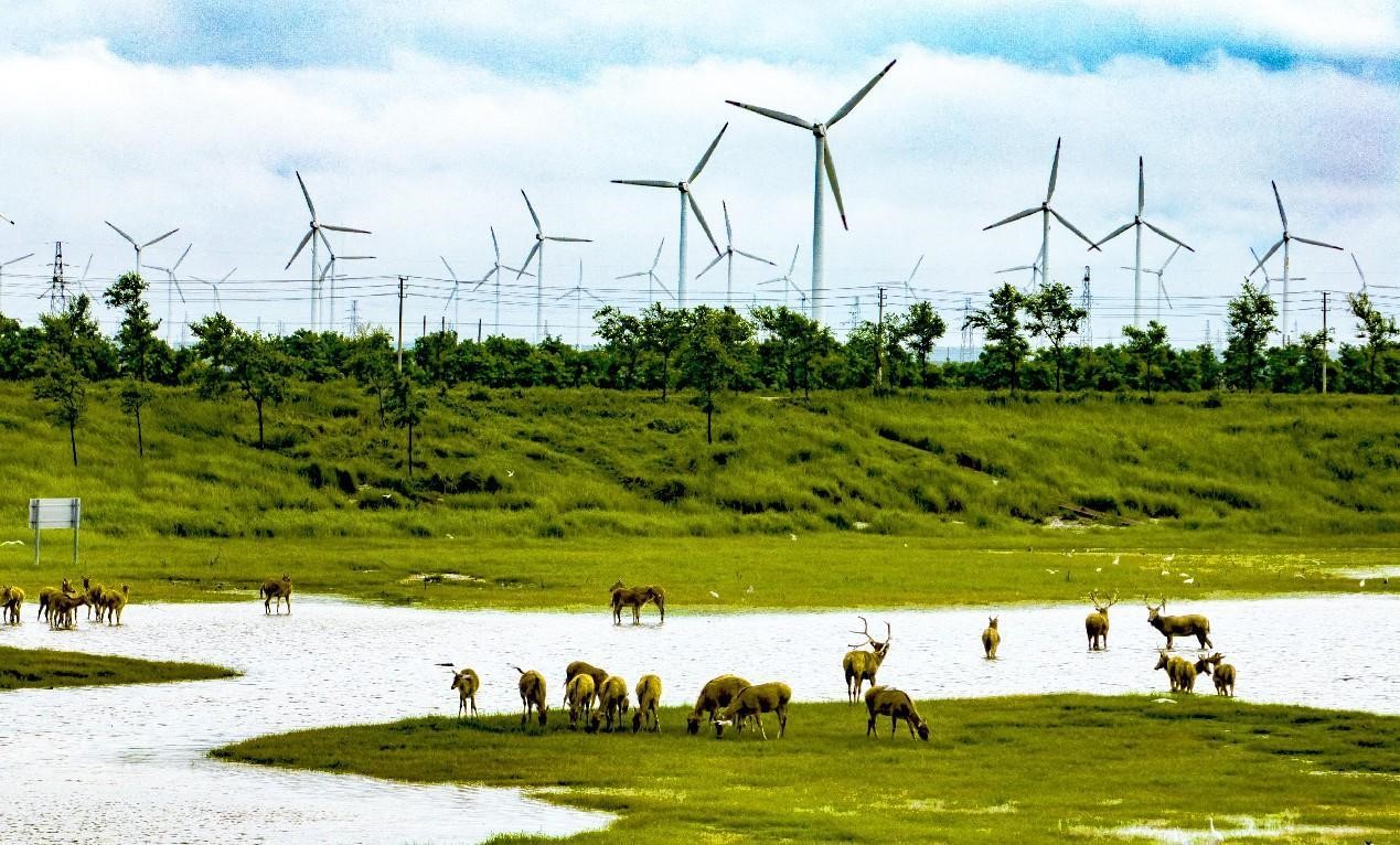 Deer forage and play on a wetland in a wind farm in Dafeng district, Yancheng, east China's Jiangsu province. (Photo by Ji Haixin/People's Daily Online)