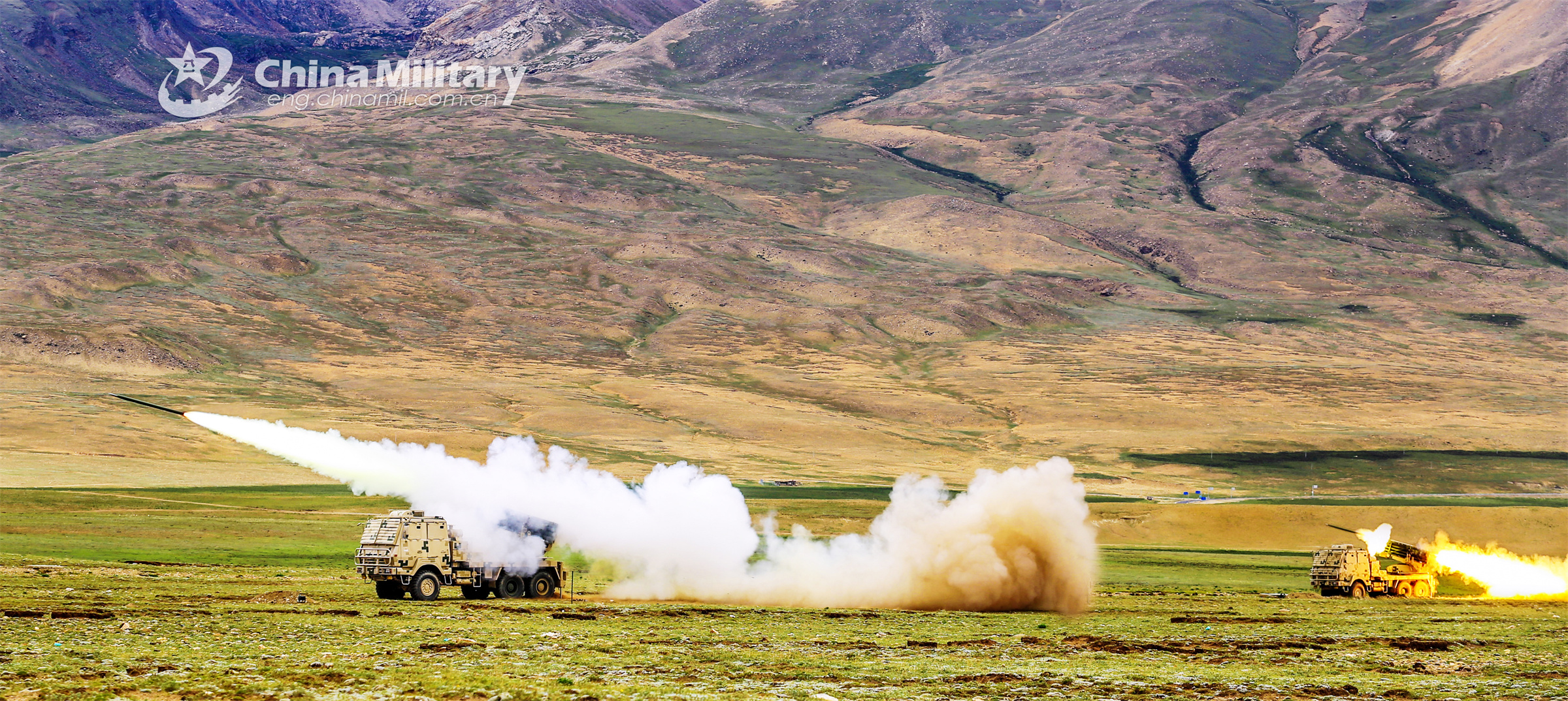 Vehicle-mounted rocket systems attached to the PLA 77th Group Army shoot against mock targets during a live-fire shooting assessment on July 11, 2023. (eng.chinamil.com.cn/Photo by Zhang Mingzhiyang)