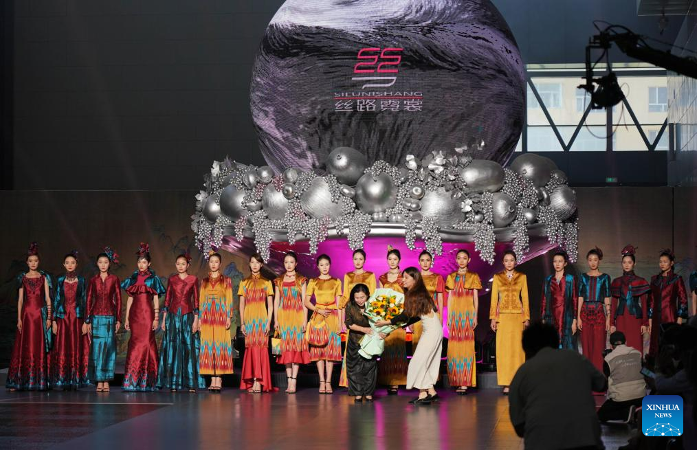 Designer Tao Tao takes a bow during the curtain call at a fashion show on the sidelines of the 6th China Xinjiang International Dance Festival, in Urumqi, northwest China's Xinjiang Uygur Autonomous Region, July 22, 2023. (Xinhua/Zhang Xiaocheng)