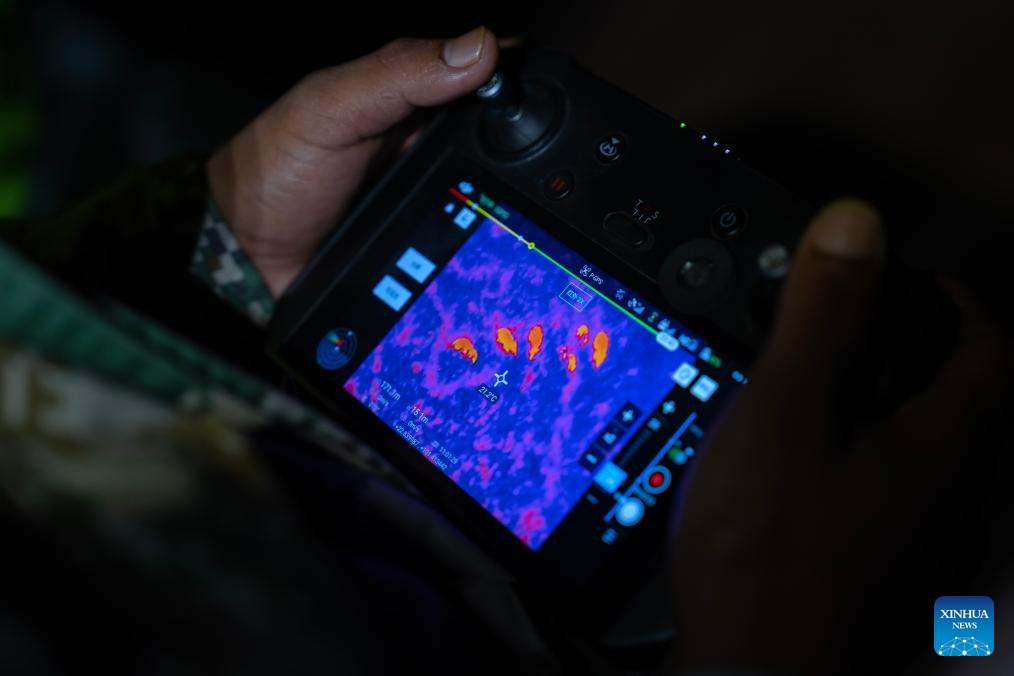 Li Jiangwei, member of an elephant monitoring squad, checks the infrared image of wild Asian elephants in Jiangcheng County, southwest China's Yunnan Province, on July 19, 2023. (Xinhua/Fei Maohua)