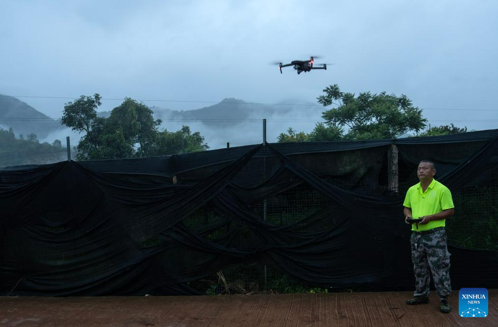 Diao Faxing, member of an elephant monitoring squad, launches a drone to track the movement of wild Asian elephants in Jiangcheng County, southwest China's Yunnan Province on July 20, 2023. (Xinhua/Fei Maohua)