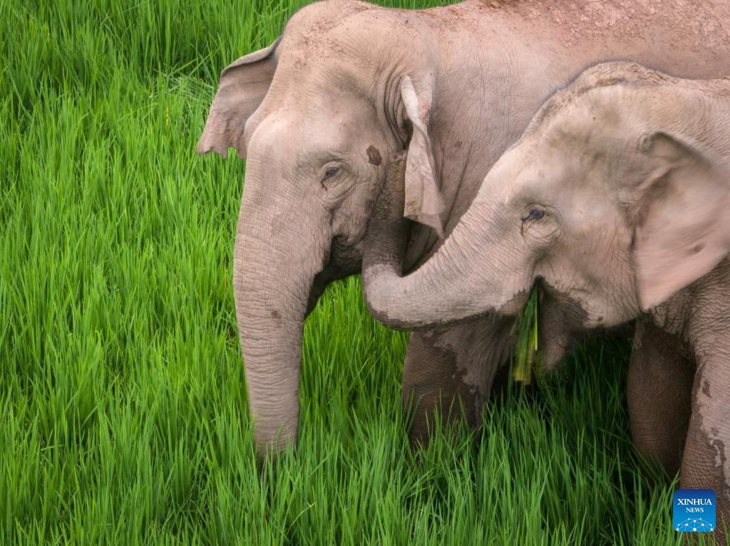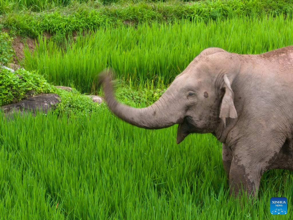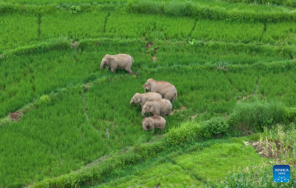 This aerial photo taken on July 19, 2023 shows wild Asian elephants foraging at a paddy rice field in Jiangcheng County, southwest China's Yunnan Province. (Xinhua/Chen Xinbo)
