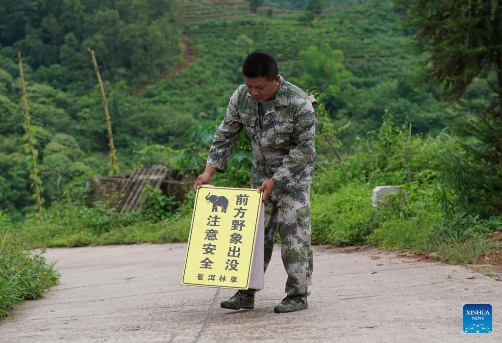 A staff member places a cordon sign on a road where wild Asian elephants are found in Jiangcheng County, southwest China's Yunnan Province, on July 19, 2023. (Xinhua/Chen Xinbo)