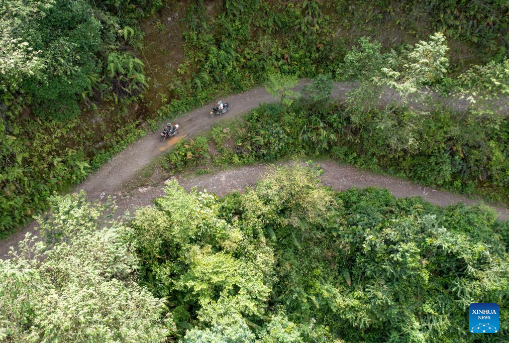 This aerial photo taken on July 20, 2023 shows two members of an elephant monitoring squad in operation in Jiangcheng County, southwest China's Yunnan Province. (Xinhua/Chen Xinbo)