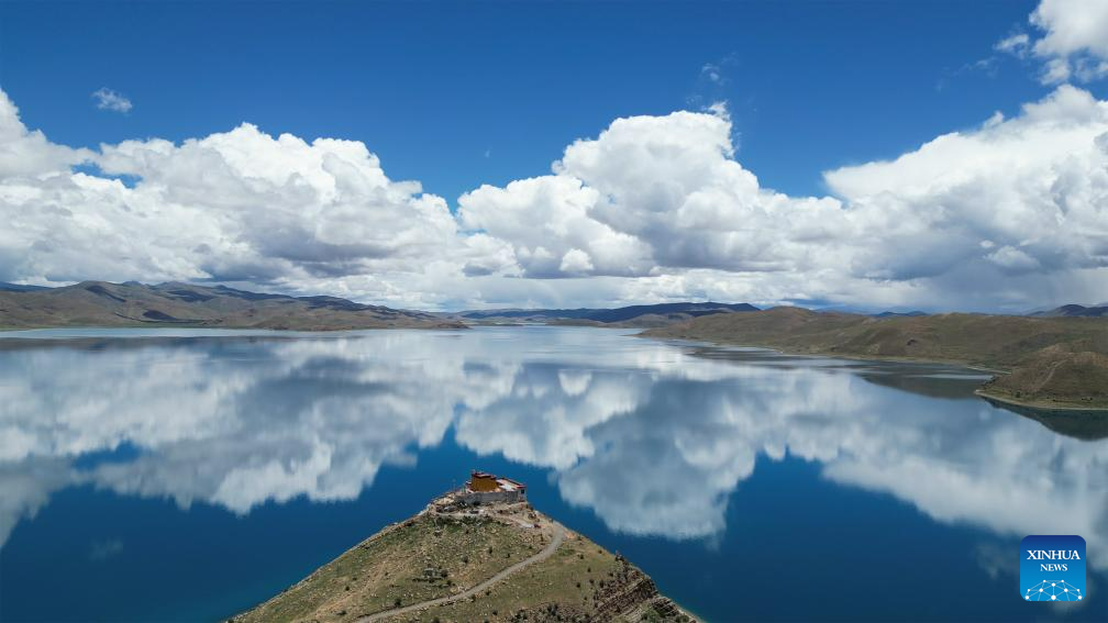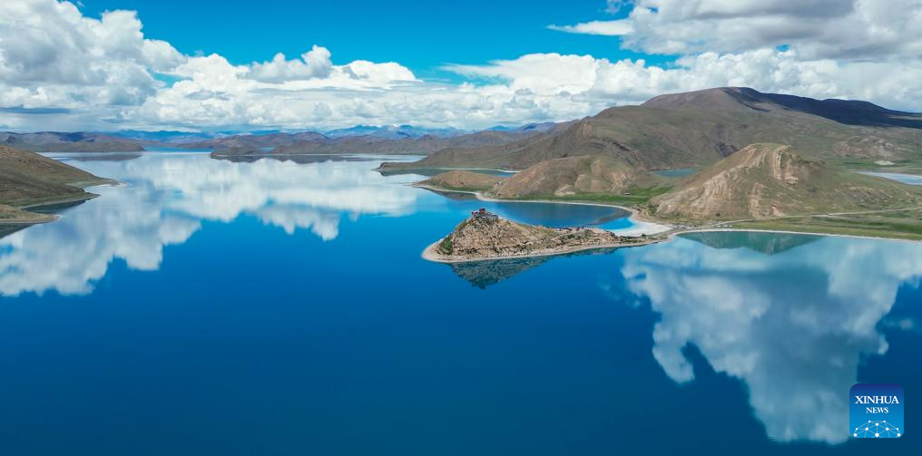 This aerial photo taken on July 22, 2023 shows the Rituo Temple on the north shore of Yumzhog Yumco Lake in southwest China's Tibet Autonomous Region. (Xinhua/Nie Yi)