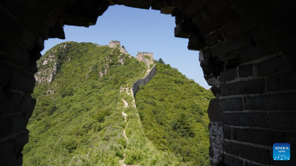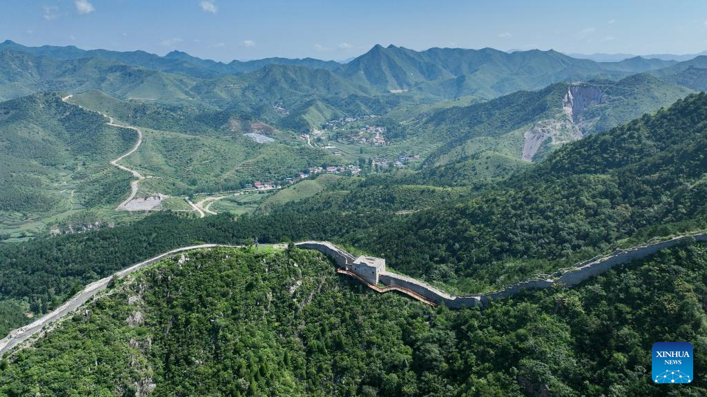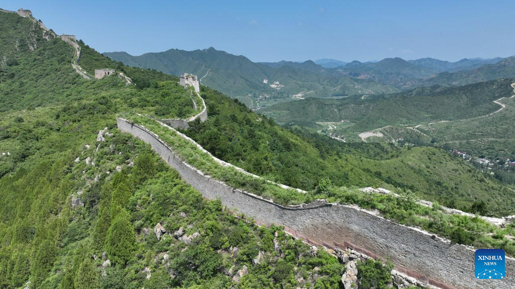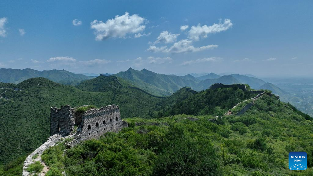 This aerial photo taken on July 23, 2023 shows the scenery of the Baiyangyu section of the Great Wall in Qian'an City of north China's Hebei Province. (Xinhua/Mu Yu)