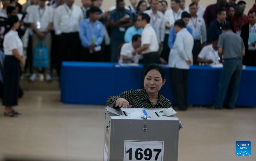 A woman casts her ballot at a polling station in Kandal province, Cambodia, on July 23, 2023. The seventh general election kicked off in Cambodia on Sunday with a total of 18 political parties taking part in the race, a National Election Committee (NEC) spokesman said. (Photo by Phearum/Xinhua)