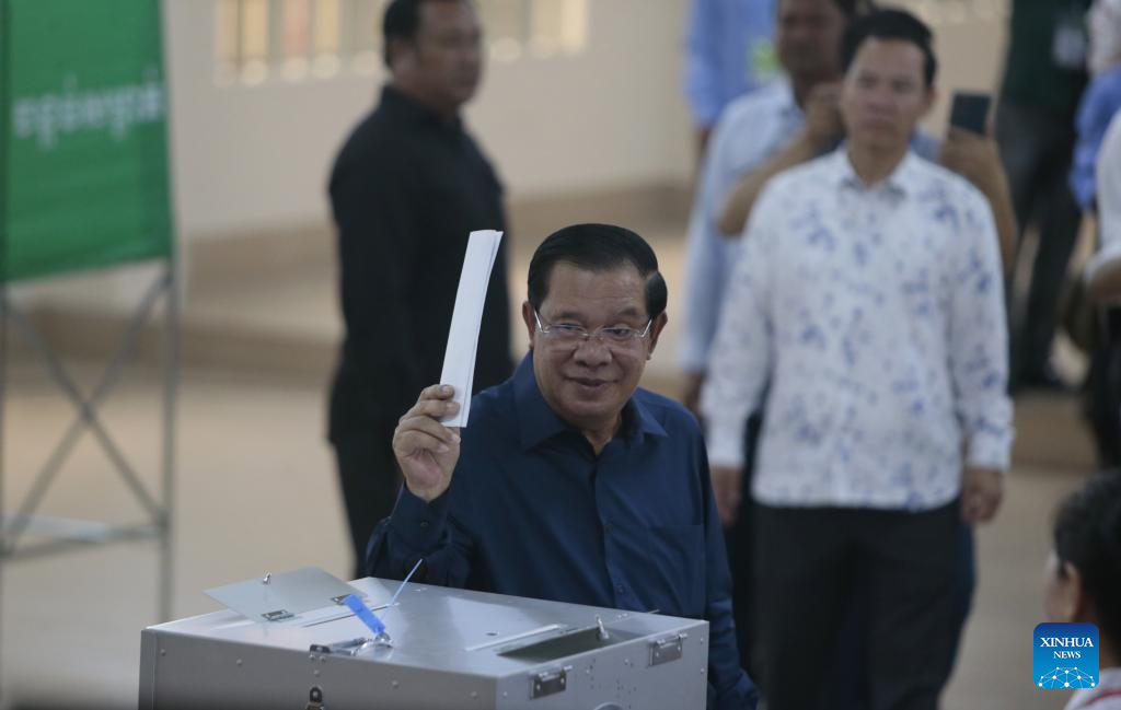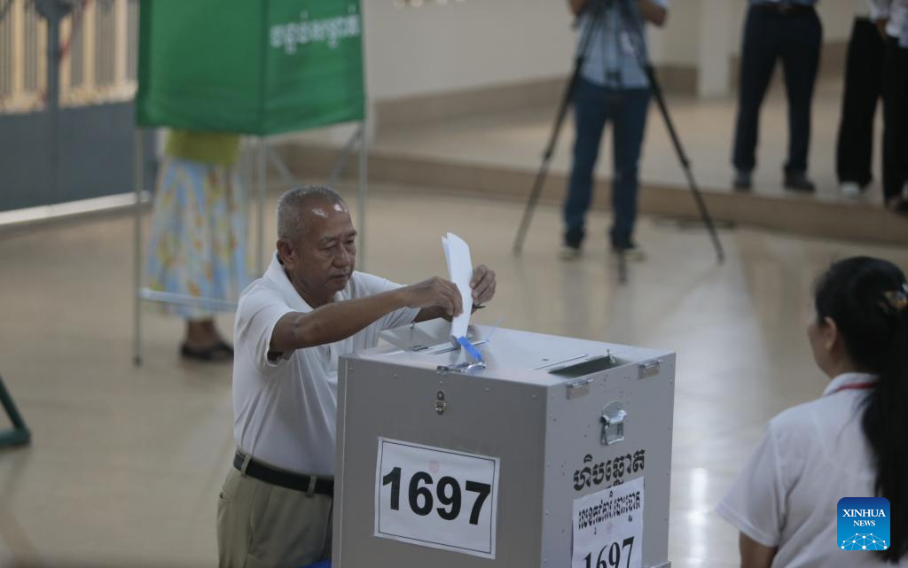 A man casts his ballot at a polling station in Kandal province, Cambodia, on July 23, 2023. The seventh general election kicked off in Cambodia on Sunday with a total of 18 political parties taking part in the race, a National Election Committee (NEC) spokesman said. (Photo by Phearum/Xinhua)