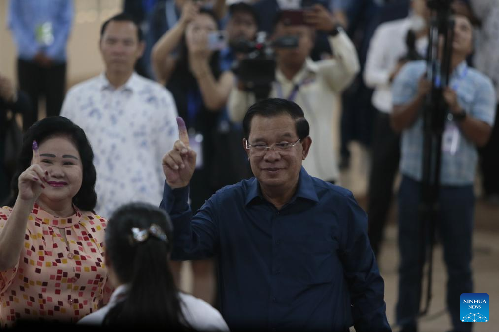 Cambodian Prime Minister Samdech Techo Hun Sen (C) shows his ink-stained finger after casting his ballot at a polling station in Kandal province, Cambodia, on July 23, 2023. The seventh general election kicked off in Cambodia on Sunday with a total of 18 political parties taking part in the race, a National Election Committee (NEC) spokesman said. (Photo by Phearum/Xinhua)