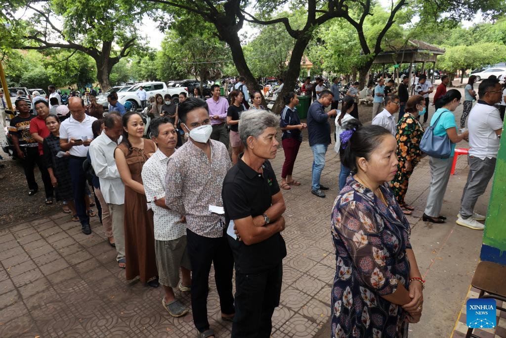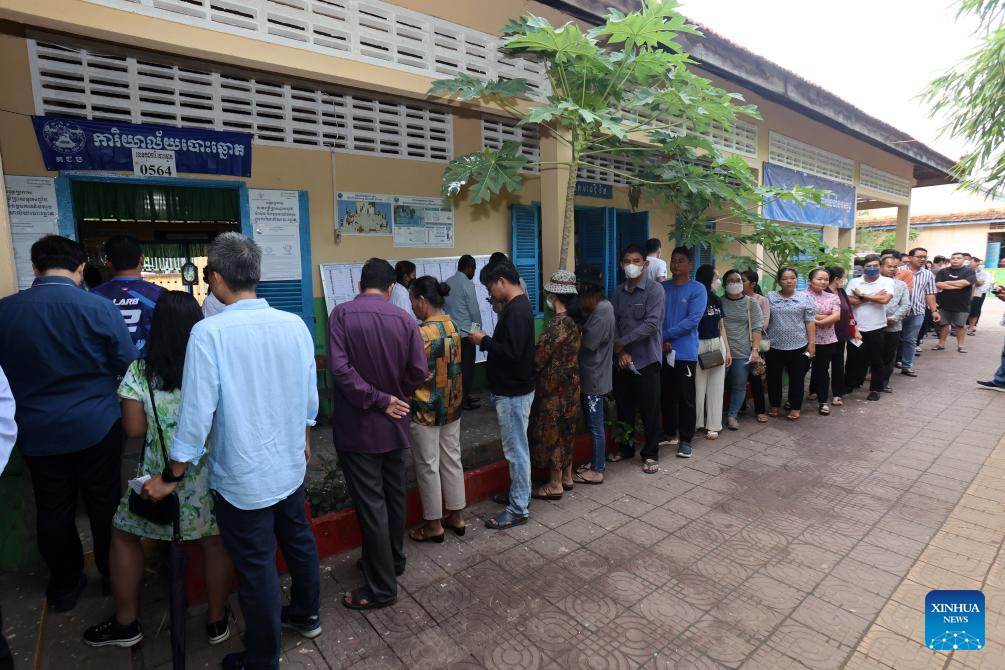 People wait for their turns to vote at a polling station in Phnom Penh, Cambodia, on July 23, 2023. The seventh general election kicked off in Cambodia on Sunday with a total of 18 political parties taking part in the race, a National Election Committee (NEC) spokesman said. (Photo by Sovannara/Xinhua)