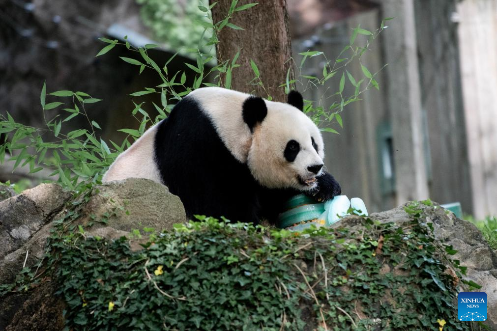 Giant panda Mei Xiang enjoys an ice cake at the Smithsonian's National Zoo in Washington, D.C., the United States, on July 22, 2023. Giant panda Mei Xiang celebrated her 25th birthday here on Saturday. The zoo organized a special party to celebrate the occasion with her fans. (Xinhua/Liu Jie)