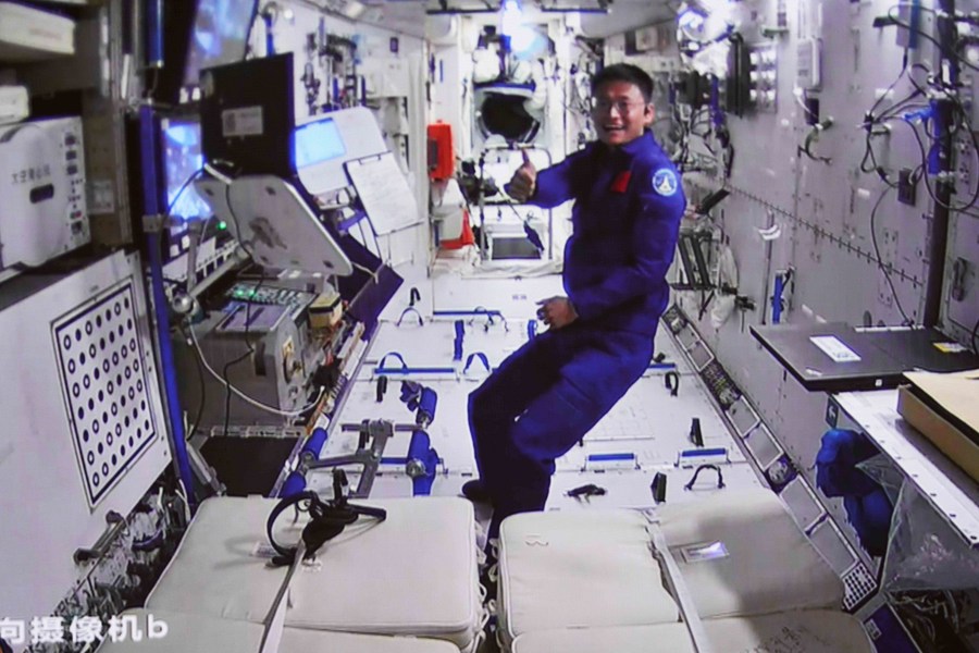 This screen image captured at Beijing Aerospace Control Center on July 20, 2023 shows Shenzhou-16 astronaut Gui Haichao giving a thumb-up for his crewmates Jing Haipeng and Zhu Yangzhu upon completion of the spacewalk. (Xinhua/Guo Zhongzheng)