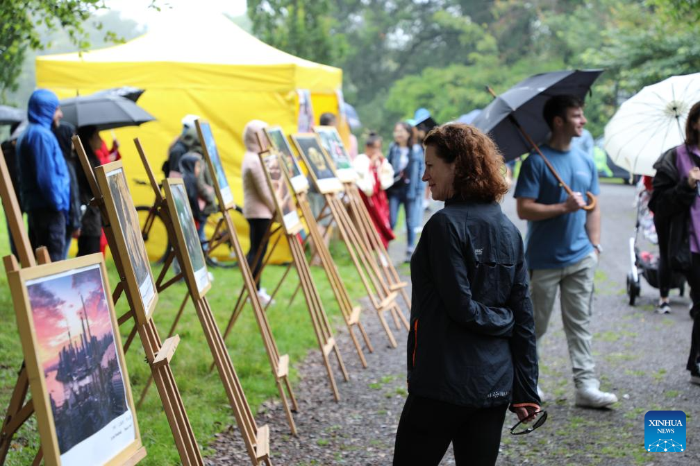 People view a photo exhibition during an event of "Chinese Culture in a Van" in Dublin, Ireland, July 23, 2023. The annual event designed to promote the Chinese culture in Ireland was held in Dublin on Sunday, drawing hundreds of local residents. (Photo by Liu Xiaoming/Xinhua)