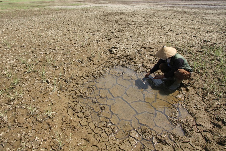 A man cleans his sickle in a puddle on the dry bed of Botok water reservoir in Sragen district, Central Java, Indonesia, July 11, 2023. (Photo by Bram Selo/Xinhua)