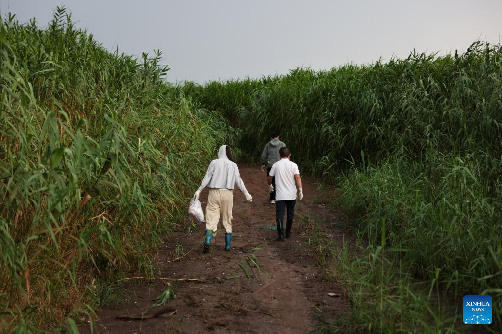 Members of the Dongting Lake Station for Wetland Ecosystem Research under the CAS collect samples in the east Dongting Lake nature reserve, central China's Hunan Province, July 9, 2023. (Xinhua/Jin Liwang)