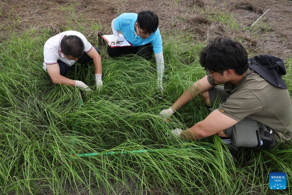Doctor Zou Yeai (L), a member of the Dongting Lake Station for Wetland Ecosystem Research under the CAS, collects sedge samples with students in the east Dongting Lake nature reserve, central China's Hunan Province, July 9, 2023. (Xinhua/Jin Liwang)