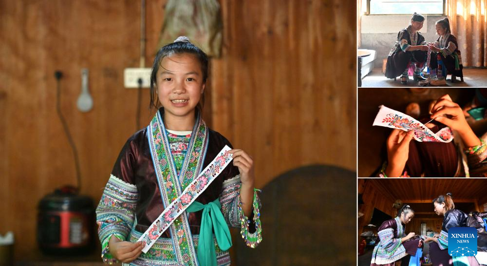 This combo photo shows primary school student Wei Wenhui, 10, posing for a photo (L) and Wei learning embroidery of the Miao ethnic group from her mother (R) in Yaogao Village, Gandong Township of Rongshui Miao Autonomous County, south China's Guangxi Zhuang Autonomous Region, July 6, 2023.?(Xinhua/Huang Xiaobang)