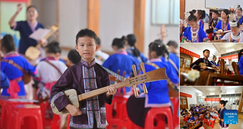 This combo photo shows primary school student Shi Jinjing, 10, posing for a photo (L) and Shi learning playing flute of the Dong ethnic group during a training course (R) in Sanjiang Dong Autonomous County, south China's Guangxi Zhuang Autonomous Region, July 13, 2023. (Xinhua/Huang Xiaobang)