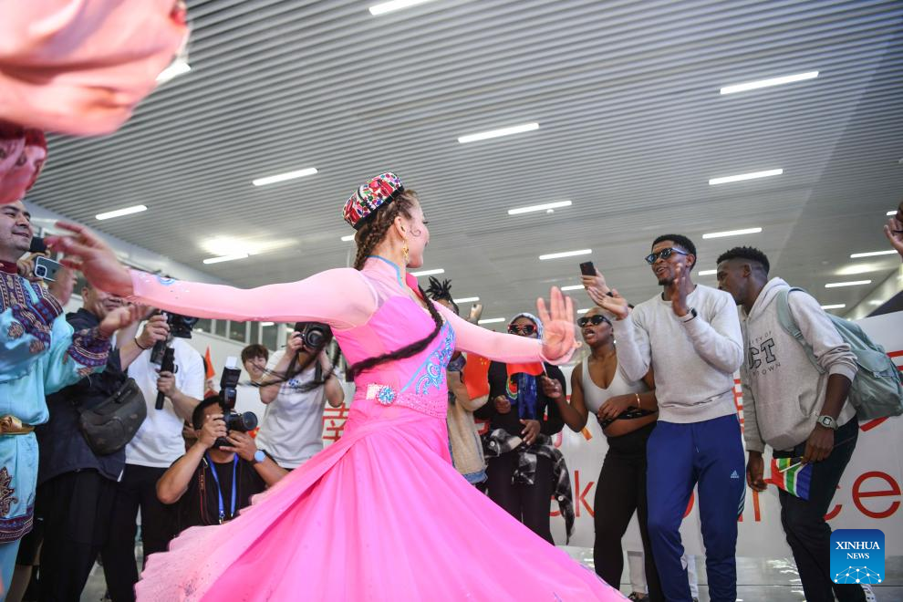 URUMQI, July 24 (Xinhua) -- As South African dancer Luyanda Mdingji stepped off the plane at Urumqi Airport in the capital of northwest China's Xinjiang Uygur Autonomous Region late Sunday, he was greeted with a heartfelt welcome. Caught up in the vibrant drum beats, he couldn't resist swaying his waist and hips while waving his arms in sync with the music.