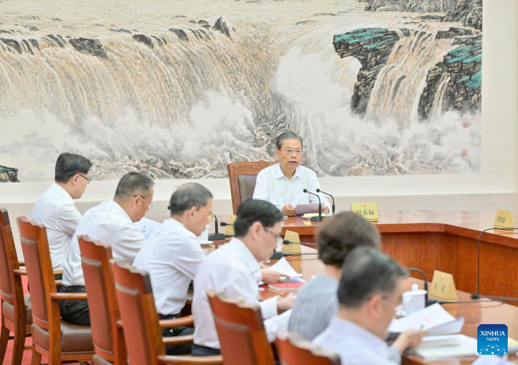 Zhao Leji, chairman of the National People's Congress (NPC) Standing Committee, presides over the eighth meeting of the Council of Chairpersons of the 14th NPC Standing Committee at the Great Hall of the People in Beijing, capital of China, July 24, 2023. (Xinhua/Gao Jie)