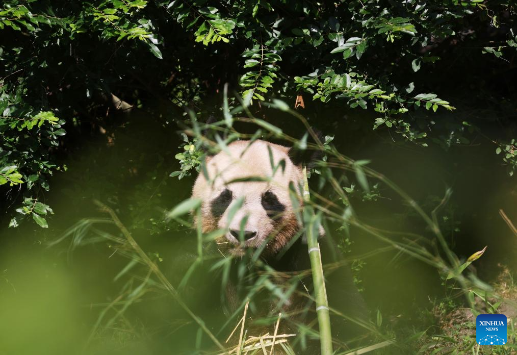This photo taken on July 24, 2023 shows the giant panda Yuan Meng at Beauval Zoo in Saint-Aignan, France. Yuan Meng, the first giant panda born in France in 2017, will return to China on Tuesday. (Xinhua/Gao Jing)