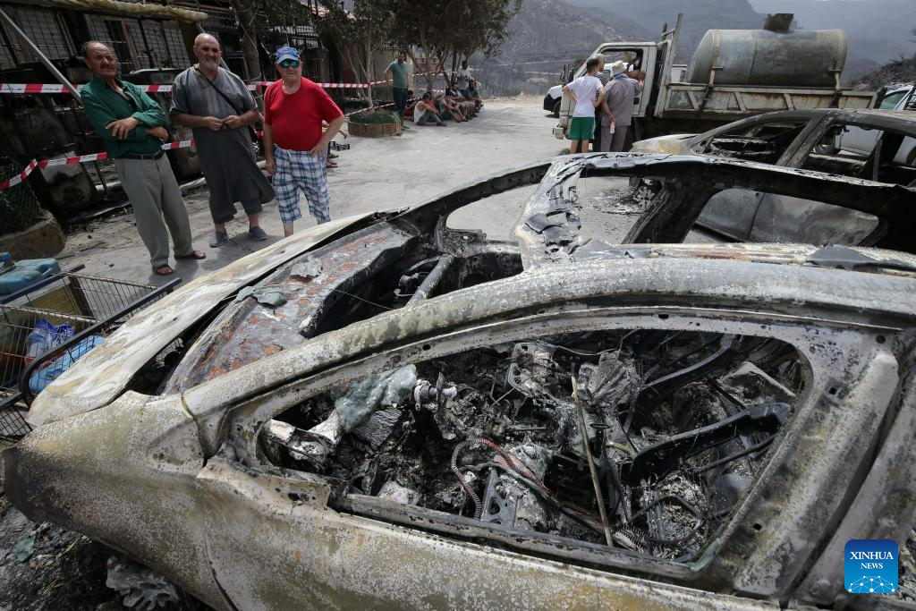 People inspect vehicles burned in a wildfire in Bejaia Province, Algeria, on July 25, 2023. The death toll from wildfires in northern Algeria has risen to 34, including 10 soldiers, the Interior Ministry said in an update on Monday. The fires started overnight on Sunday mainly in the provinces of Bejaia, Jijel, and Bouira, but quickly spread due to strong winds, causing significant damage. (Xinhua)