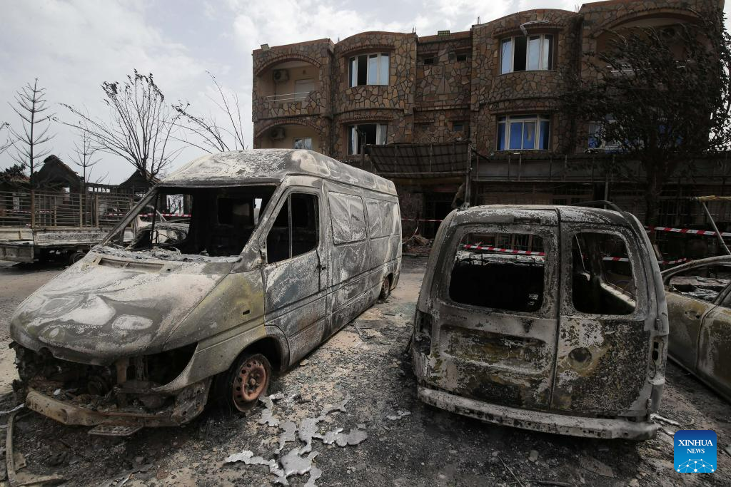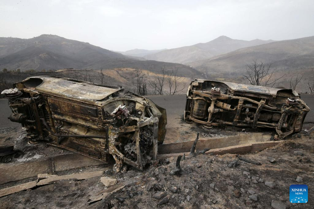 Photo taken on July 25, 2023 shows vehicles burned in a wildfire in Bejaia Province, Algeria. The death toll from wildfires in northern Algeria has risen to 34, including 10 soldiers, the Interior Ministry said in an update on Monday. The fires started overnight on Sunday mainly in the provinces of Bejaia, Jijel, and Bouira, but quickly spread due to strong winds, causing significant damage. (Xinhua)
