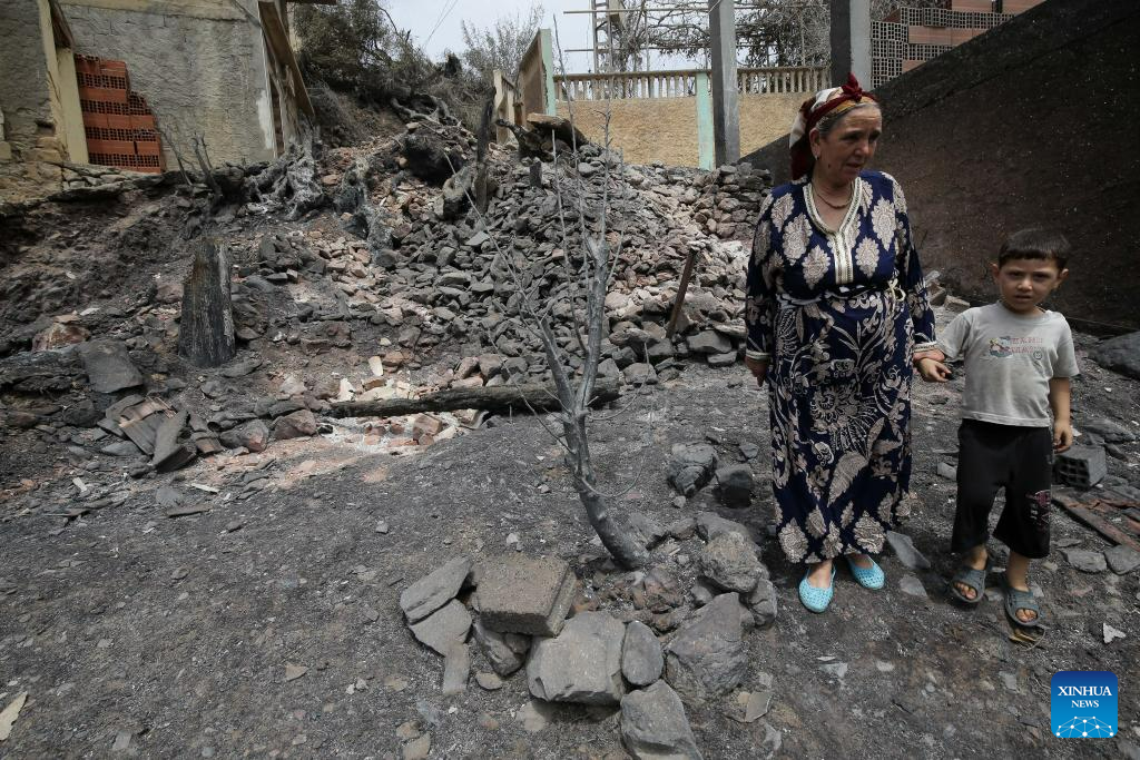 A woman and a boy stand near a house burned in a wildfire in Bejaia Province, Algeria, on July 25, 2023. The death toll from wildfires in northern Algeria has risen to 34, including 10 soldiers, the Interior Ministry said in an update on Monday. The fires started overnight on Sunday mainly in the provinces of Bejaia, Jijel, and Bouira, but quickly spread due to strong winds, causing significant damage. (Xinhua)