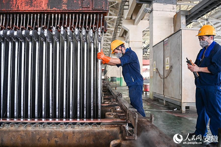 A worker puts lead plates into an electrolytic tank at Tianying Technology Park in Jieshou, Fuyang, east China's Anhui Province. (People's Daily Online/Miao Zijian)