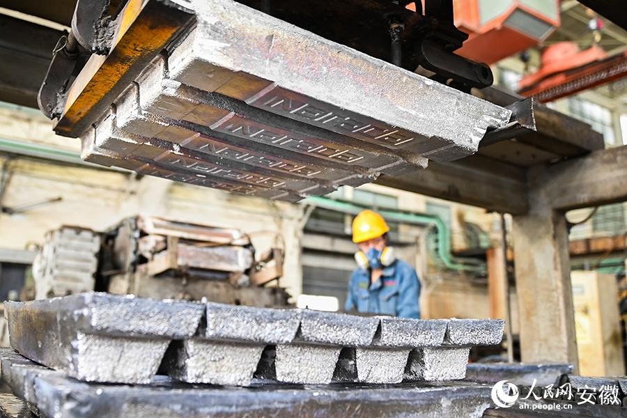 A worker works on a production line of lead blocks at Tianying Technology Park in Jieshou, Fuyang, east China's Anhui Province. (People's Daily Online/Miao Zijian)