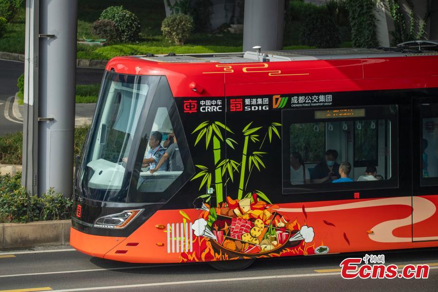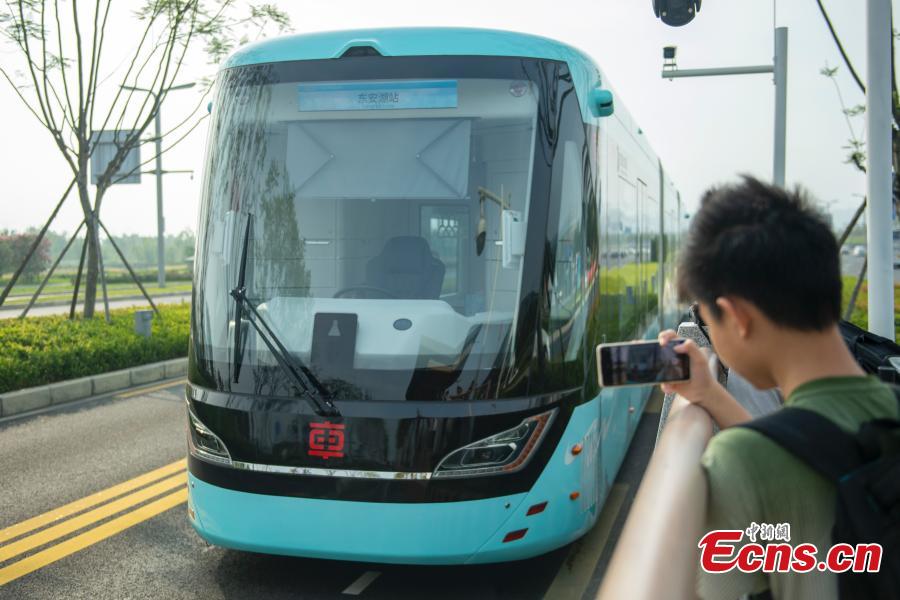 A passenger takes photos of a smart trackless "rail bus" in Chengdu, southwest China's Sichuan Province, July 25, 2023. (Photo: China News Service/Liu Zhongjun)