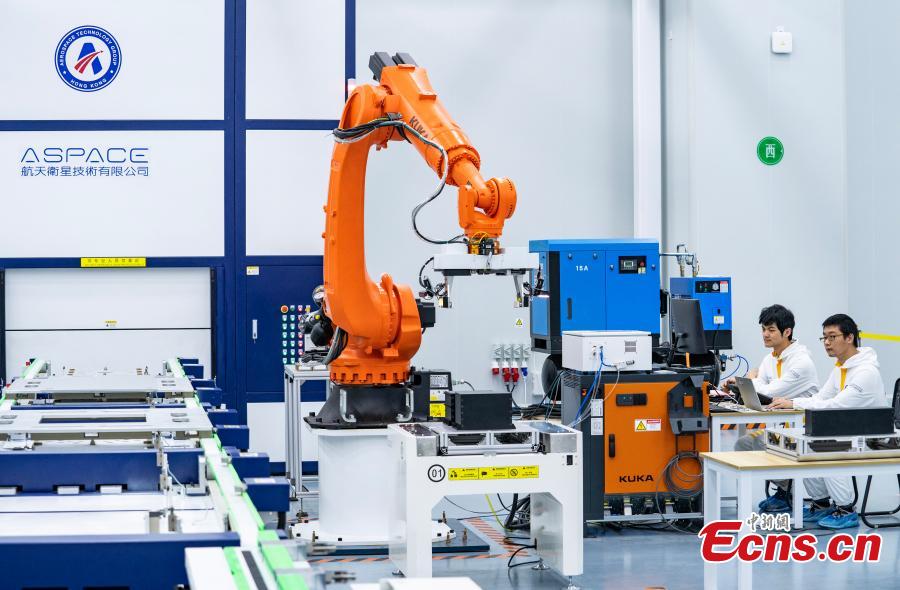 A robot arm demonstrates on an assembly line at the Hong Kong Satellite Manufacturing Center, July 25, 2023. (Photo: China News Service/Hou Yu)
