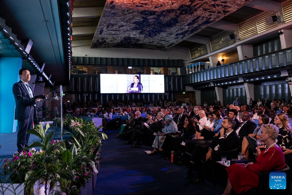 FAO Director-General Qu Dongyu (1st L) speaks at the closing ceremony of the United Nations Food Systems Summit +2 Stocktaking Moment (UNFSS+2) in Rome, Italy, on July 26, 2023. Three days of high-level stocktaking talks on food security have underlined the challenges that lie ahead, said the head of the United Nations Food and Agriculture Organization (FAO) on Wednesday. (Alessandra Benedetti/FAO/Handout via Xinhua)