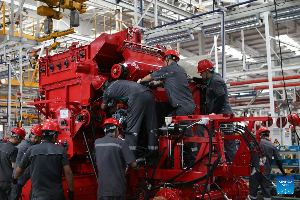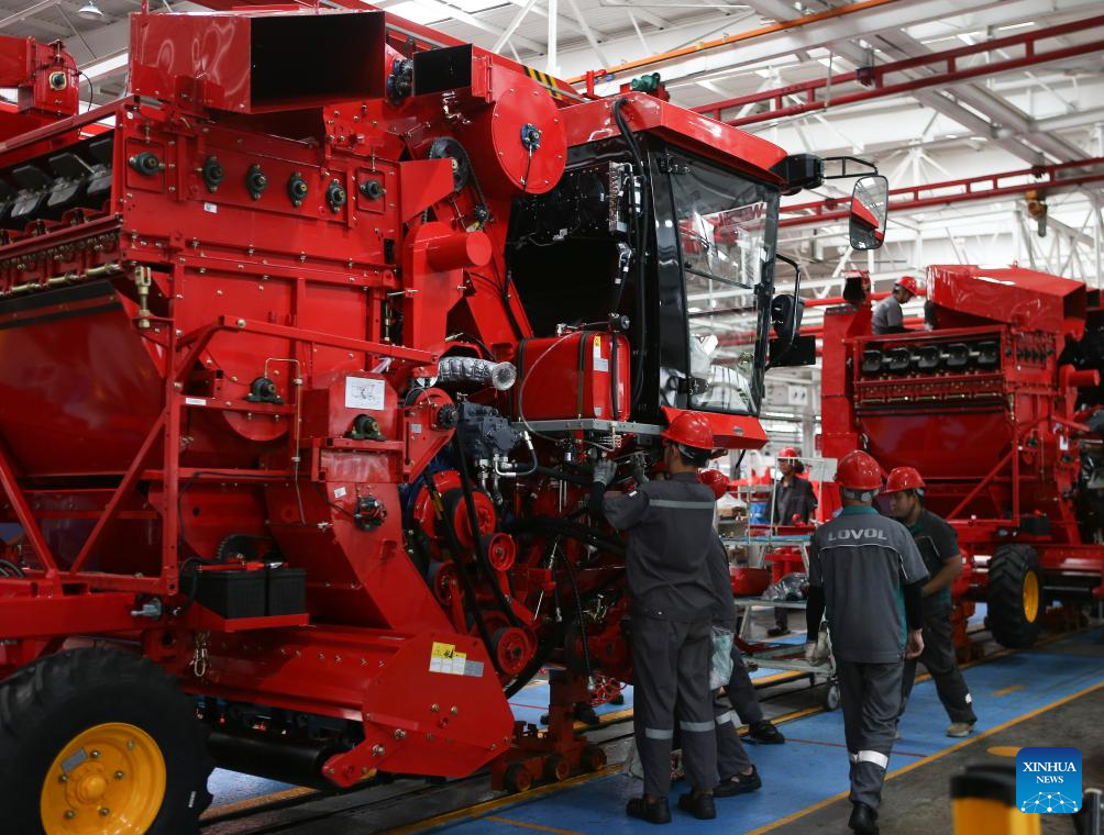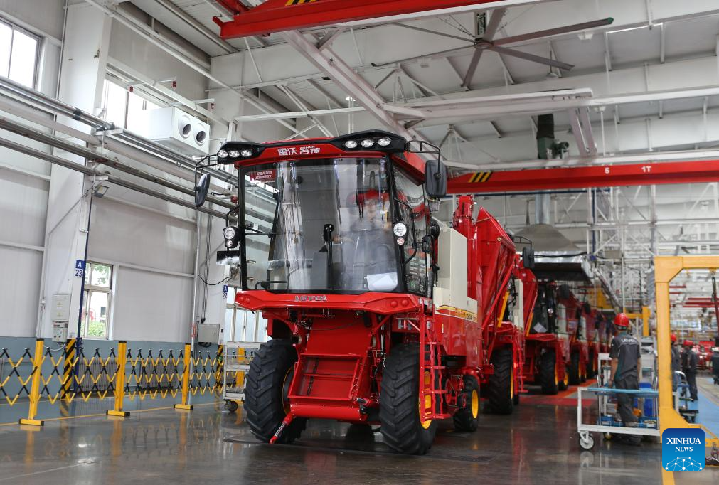 Workers assemble corn harvesters at a workshop of Weichai Lovol Intelligent Agricultural Technology Co., Ltd. in Weifang City, east China's Shandong Province, July 26, 2023.?(Xinhua/Zhang Haobo)