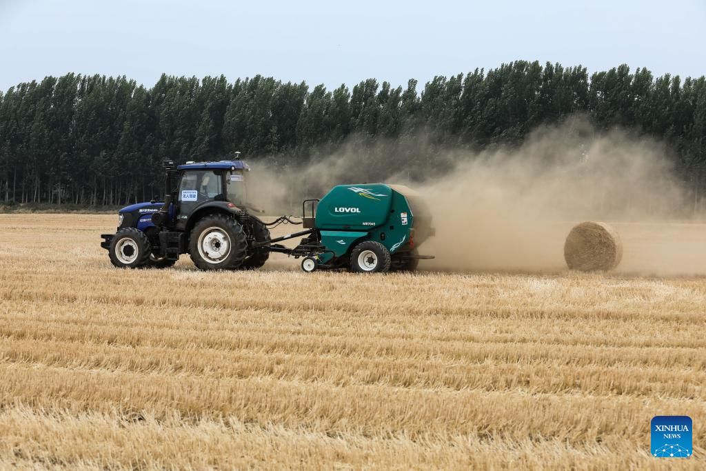 An unmanned farm machine performs baling operations in a demonstration field of Weichai Lovol Intelligent Agricultural Technology Co., Ltd. in Weifang City, east China's Shandong Province, June 17, 2023.?(Xinhua/Zhang Haobo)