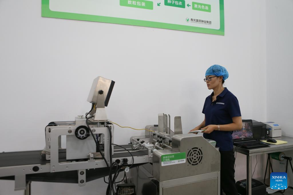 A worker prints codes on seed packages at a packing workshop of Shouguang Vegetable Seeds Group in Shouguang City of Weifang, east China's Shandong Province, July 26, 2023.?(Xinhua/Zhang Haobo)