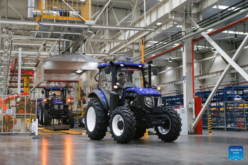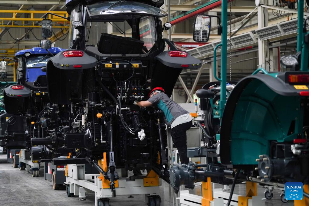 Workers assemble tractors at a workshop of Weichai Lovol Intelligent Agricultural Technology Co., Ltd. in Weifang City, east China's Shandong Province, July 26, 2023.?(Xinhua/Zhang Haobo)