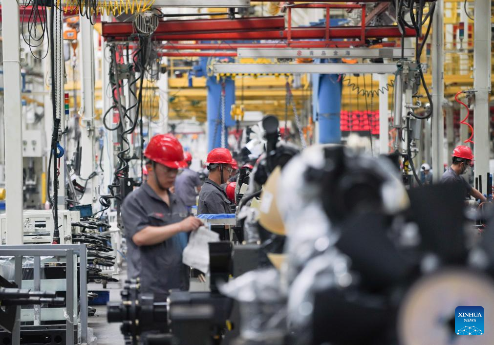 Workers assemble tractor parts at a workshop of Weichai Lovol Intelligent Agricultural Technology Co., Ltd. in Weifang City, east China's Shandong Province, July 26, 2023.?(Xinhua/Zhang Haobo)
