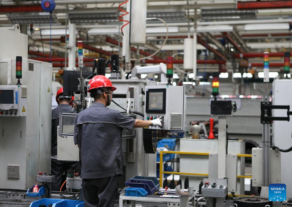 Workers operate equipment at a workshop of Weichai Lovol Intelligent Agricultural Technology Co., Ltd. in Weifang City, east China's Shandong Province, July 26, 2023. (Xinhua/Zhang Haobo)