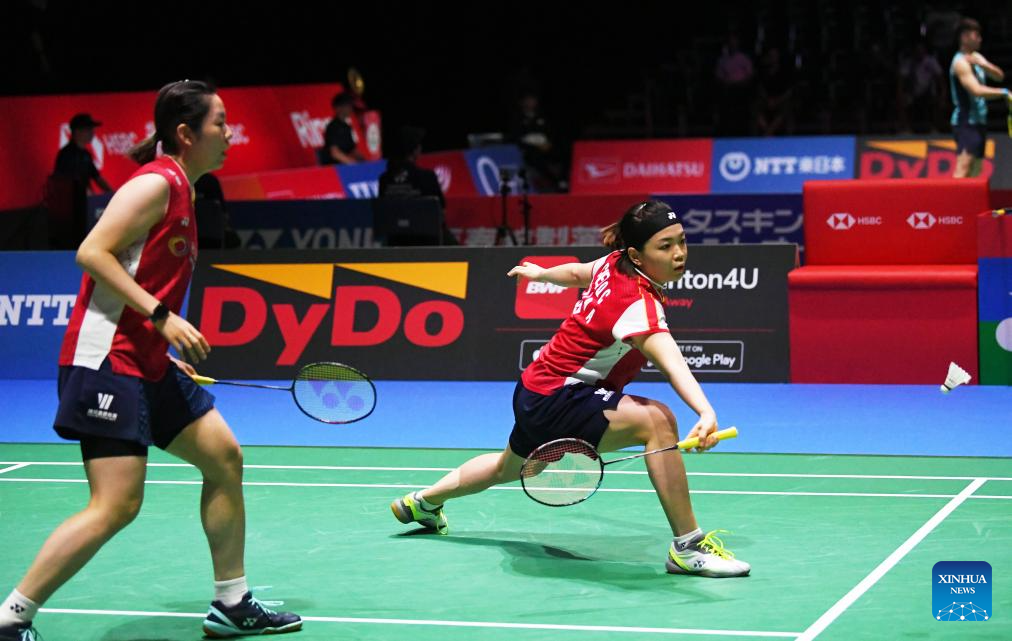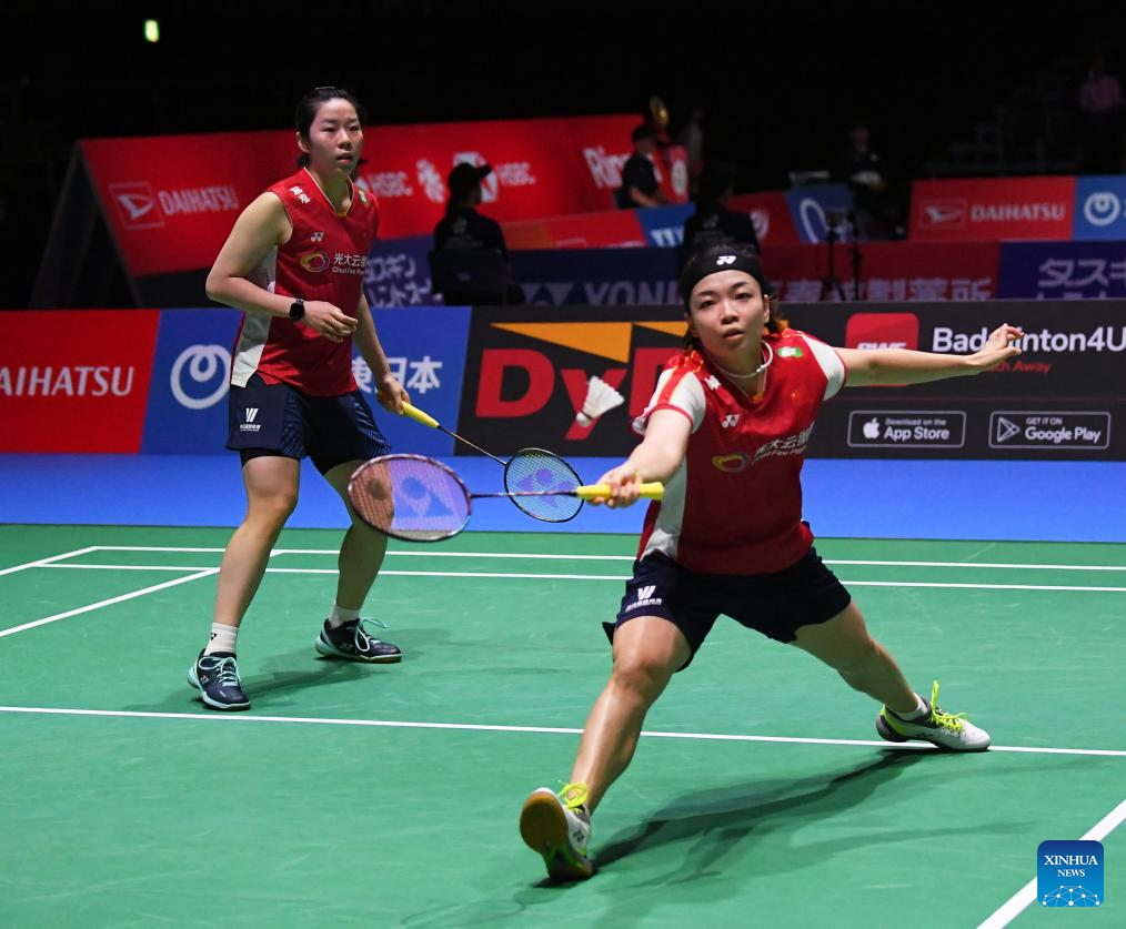 Chen Qingchen (L)/Jia Yifan of China compete during the women's doubles second round match against Pearly Tan/Thinaah Muralitharan of Malaysia at the Japan Open Badminton Championships 2023 in Tokyo, Japan, July 27, 2023. (Xinhua/Yang Guang)