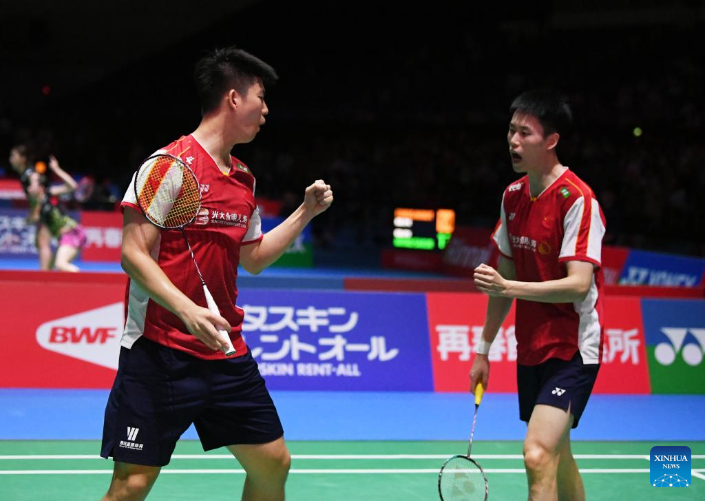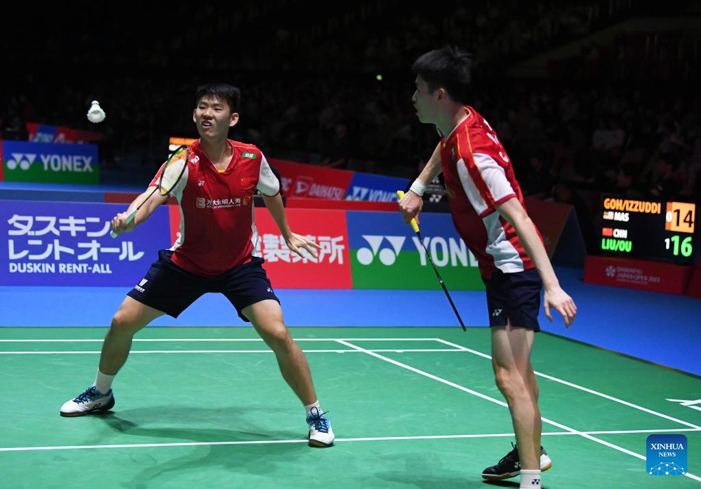 Liu Yuchen(L)/Ou Xuanyi of China compete during the men's doubles second round match against Goh Sze Fei/Nur Izzuddin of Malaysia at the Japan Open Badminton Championships 2023 in Tokyo, Japan, July 27, 2023. (Xinhua/Yang Guang)