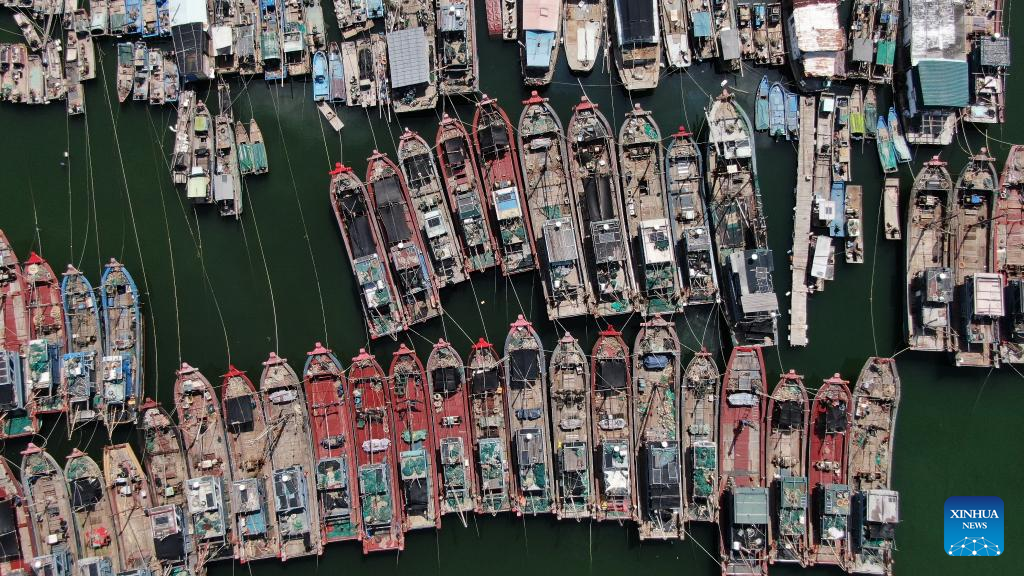 This aerial photo shows fishing boats taking shelter at a harbor as Typhoon Doksuri approaches in Chaozhou City of south China's Guangdong Province, July 27, 2023. (Xinhua/Wang Ruiping)