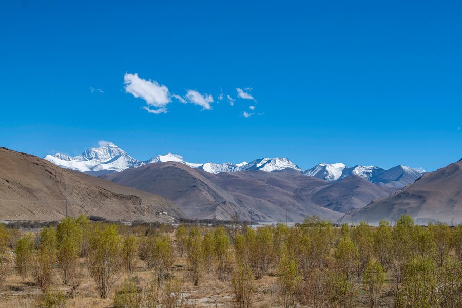 Photo taken on May 10, 2022 shows trees in the Qomolangma National Nature Reserve in Zhaxizom Township in Tingri County, southwest China's Tibet Autonomous Region. (Xinhua/Sun Fei)